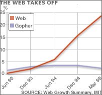 Initially fully graphical browsers were not available, and Gopher, before its licensing induced stagnation, was actually on the fast-track to popularizing them first. In fact, advancing even beyond static graphical browsing is relatively easy with Gopher (due to the universal understructure the Protocol imposes on every Gopher Server), and graphical 3-D "Virtual Reality" burrowing of gopherspace was demonstrated as far back as 1994. To give you an idea of the state of the HTTP during Gophers prominence, here is a link to a reproduction of the struggling original CERN website, and a link to an emulator of an early HTTP Browser. For another example, note how the page you are currently reading looks, which is a modern web page laid out in a hierarchical format, using only core HTML without much of the added bling (and therefore a more objective HTTP to Gopher rendering comparison).
